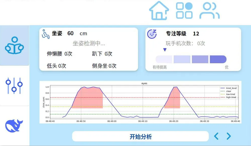 一是基于微表情训练集与YOLO模型,检测眨眼频率、打瞌睡、玩手机等行为,超时则触发语音提醒;