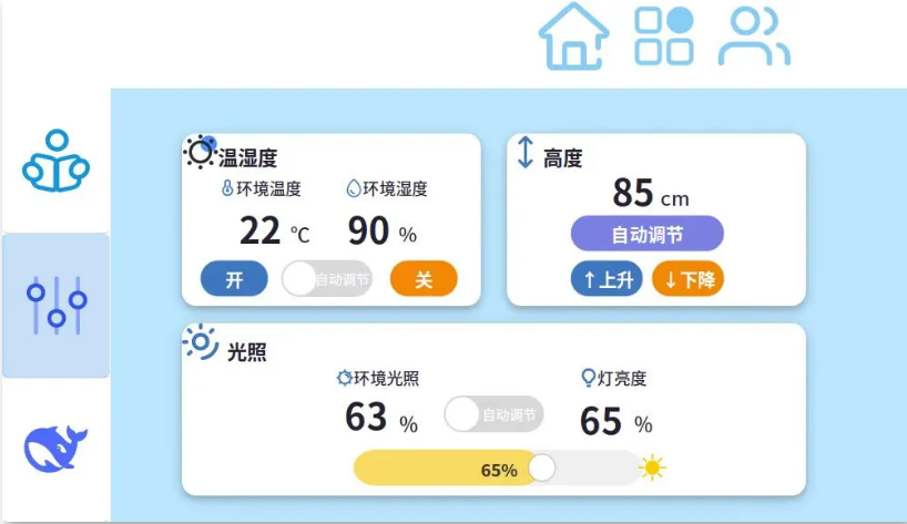 技术上采用多模态感知融合,以6TOPS算力的NPU部署轻量化YOLO模型(帧率≥30fps),协同超声波、温湿度等传感器实现多维度数据采集;嵌入式优化支持步进电机驱动桌面升降(范围75-125cm)、PWM无级调光;跨平台交互通过Qt本地GUI(实时显示数据与控制)与MQTT协议云端同步,实现家长远程监控。