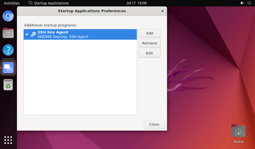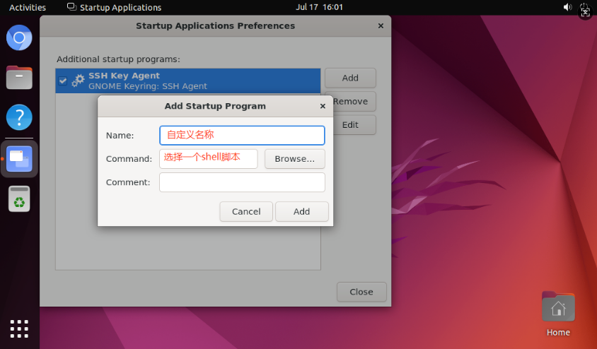 通过 gnome-session-properties 命令可以打开开机自启工程配置界面,在这里添加用户自己的应用/脚本即可,下述以HelloWorld为例进行测试。