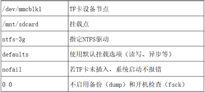 创建ntfs_fs目录作为NTFS格式TF卡的挂载点,-t ntfs-3g指定使用ntfs-3g驱动挂载NTFS格式(Linux 下NTFS读写的常用驱动),将dev/mmcblk1挂载到ntfs_fs/。