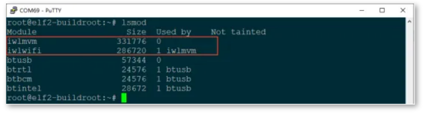 root@elf2-desktop:/usr/lib/modules# syncroot@elf2-desktop:/usr/lib/modules# reboot//重启之后使用lsmod查看root@elf2-desktop:~# lsmodModule Size Used byiwlmvm 331776 0iwlwifi 286720 1 iwlmvmbtusb 57344 0btrtl 24576 1 btusbbtbcm 24576 1 btusbbtintel 28672 1 btusb