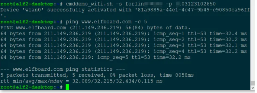 root@elf2-desktop:~# cp /run/media/sda1/cmddemo_wifi.sh /usr/bin///root@elf2-desktop:~# cmddemo_wifi.sh -s SSID -p password//SSID:热点名称; password:热点密码。root@elf2-desktop:~# cmddemo_wifi.sh -s forlinx -p 03123102650Device 'wlan0' successfully activated with '81a9889a-44e1-4c47-9b49-c90850ca96ff'.//拨号成功之后ping下elfboard官网,能ping通说明WiFi可以正常使用root@elf2-desktop:~# ping www.elfboard.com -c 5PING www.elfboard.com (211.149.236.219) 56(84) bytes of data.64 bytes from 211.149.236.219 (211.149.236.219): icmp_seq=1 ttl=53 time=32.2 ms64 bytes from 211.149.236.219 (211.149.236.219): icmp_seq=2 ttl=53 time=32.0 ms64 bytes from 211.149.236.219 (211.149.236.219): icmp_seq=3 ttl=53 time=32.0 ms64 bytes from 211.149.236.219 (211.149.236.219): icmp_seq=4 ttl=53 time=31.9 ms64 bytes from 211.149.236.219 (211.149.236.219): icmp_seq=5 ttl=53 time=32.3 ms--- www.elfboard.com ping statistics ---5 packets transmitted, 5 received, 0% packet loss, time 4005msrtt min/avg/max/mdev = 31.948/32.074/32.266/0.140 ms