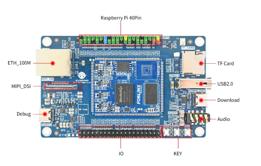 ELF-RK3506开发板仅105×65mm的紧凑尺寸,便于携带与实验。虽然身材小巧,但它仍然提供了丰富的接口资源,包括USB、以太网等通信接口,以及MIPI、Audio等音视频接口,此外,开发板上预留的40pin排针可兼容树莓派的各种模块,矩阵IO设计将98个功能信号灵活映射至32个引脚,破解传统接口资源限制,可以充分满足高校师生及个人学习者从基础到进阶的学习需求。