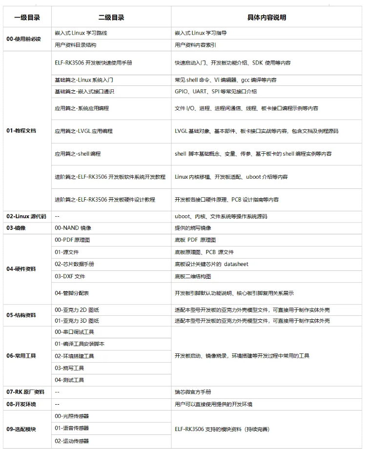 不仅如此,开发板附带了系统而全面的课程资料,包括:教程文档、Linux内核源代码、系统镜像、硬件资料、RK原厂工具与文档,以及完整的开发环境。这些资源完整覆盖了嵌入式Linux的开发全流程,能有效帮助高校师生及个人学习者快速入门并掌握相关开发技能。