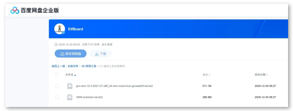 厂商提供了用于编译的VMWare环境,不过我没有用,还是喜欢使用Windows自带的WSL2。下面介绍一下如何配置WSL编译环境。首先从厂商的资料云盘上下载两个软件包:https://www.elfboard.com/information/detail.html?id=8