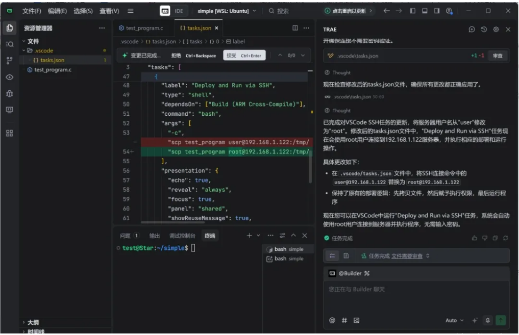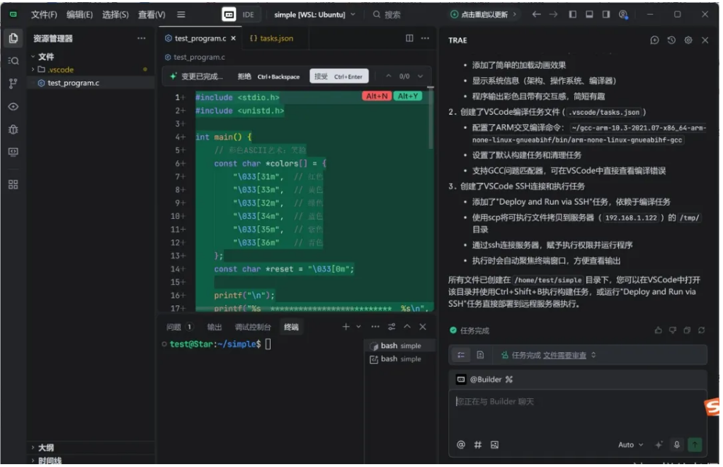TRAE开始勤奋的工作,开始生成C程序代码(test_program.c)和任务代码(task.json)。