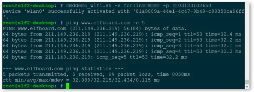 root@elf2-desktop:~# cp /run/media/sda1/cmddemo_wifi.sh /usr/bin///root@elf2-desktop:~# cmddemo_wifi.sh -s SSID -p password//SSID:热点名称; password:热点密码。root@elf2-desktop:~# cmddemo_wifi.sh -s forlinx -p 03123102650Device 'wlan0' successfully activated with '81a9889a-44e1-4c47-9b49-c90850ca96ff'.//拨号成功之后ping下elfboard官网,能ping通说明WiFi可以正常使用root@elf2-desktop:~# ping www.elfboard.com -c 5PING www.elfboard.com (211.149.236.219) 56(84) bytes of data.64 bytes from 211.149.236.219 (211.149.236.219): icmp_seq=1 ttl=53 time=32.2 ms64 bytes from 211.149.236.219 (211.149.236.219): icmp_seq=2 ttl=53 time=32.0 ms64 bytes from 211.149.236.219 (211.149.236.219): icmp_seq=3 ttl=53 time=32.0 ms64 bytes from 211.149.236.219 (211.149.236.219): icmp_seq=4 ttl=53 time=31.9 ms64 bytes from 211.149.236.219 (211.149.236.219): icmp_seq=5 ttl=53 time=32.3 ms--- www.elfboard.com ping statistics ---5 packets transmitted, 5 received, 0% packet loss, time 4005msrtt min/avg/max/mdev = 31.948/32.074/32.266/0.140 ms