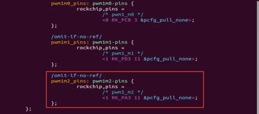 打开以下文件,找到PWM1_M2相关定义,其中pwm1m2_pins节点已明确配置 GPIO1_A3(pwm1_m2)的复用,配置内容如下: